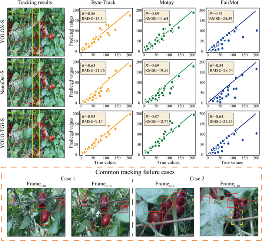 实验结果表明,YOLO-TGI 和 Byte-Track 的组合实现了最稳健的性能。特别是,YOLO-TGI-N 成为计算需求最少的模型,其 FLOP 最低为 2.05 G,权重仅为 3.7 M,同时仍保持叶病检测的 mAP 为 0.72。在水果计数方面,YOLO-TGI-S与Byte-Track的组合取得了最佳R 2为0.93和最低RMSE 9.17,推理速度是当前最优YOLOX系列的2倍。该模型面向真实世界的温室种植场景,能够推广到广泛种植的水果和蔬菜(如苹果、橙子、葡萄和草莓)的类似监测任务中。