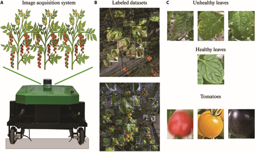 在这项研究中,研究人员首先采用带有智能手机摄像头的自主运动机器人来收集温室中叶病和水果的图像。然后,通过整合 Ghost 和 CBAM 模块改进了深度学习网络 YOLO-TGI,该模块与 YOLOX 和 NanoDet 等顶级轻量级检测模型一起进行了训练和测试,用于评估叶子健康状况。