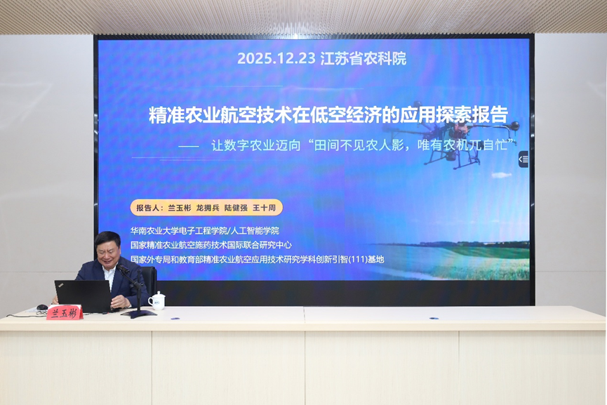 调研期间,兰玉彬受邀在第十四期“智说三农·三农论智”智慧农业学术论坛上作报告。他以《精准农业航空技术在低空经济的应用探索报告》为题,结合我国精准农业航空发展历程与产业现状,从“发展与应用”“关键技术与装备”“低空经济融合发展”“生态无人农场探索实践”四个维度,系统分享了团队研究进展与实践经验。与会人员就相关研究热点及科研实践中的问题与专家展开了热烈交流与深入探讨。