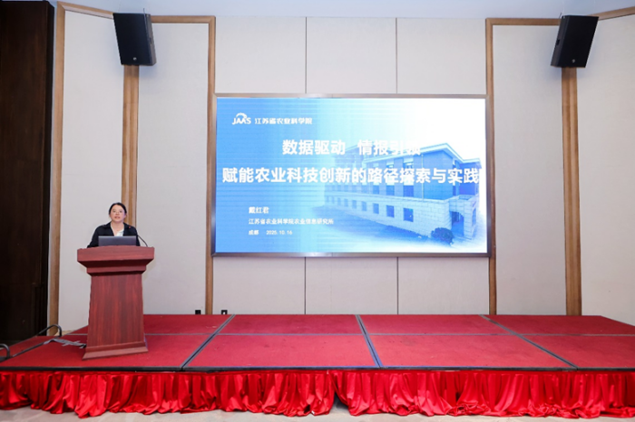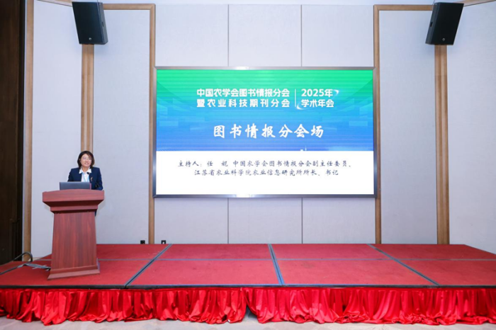 会上,任妮主持图书情报分会场报告环节。图书馆馆长戴红君以《数据驱动,情报引领:赋能农业科技创新的路径探索与实践》为题作学术报告,介绍了江苏省农科院图书馆在服务数智化转型过程中的探索与实践,重点分享了在学科态势分析、竞争力评价、农业产业监测预警等深层次情报服务方面的经验做法。
