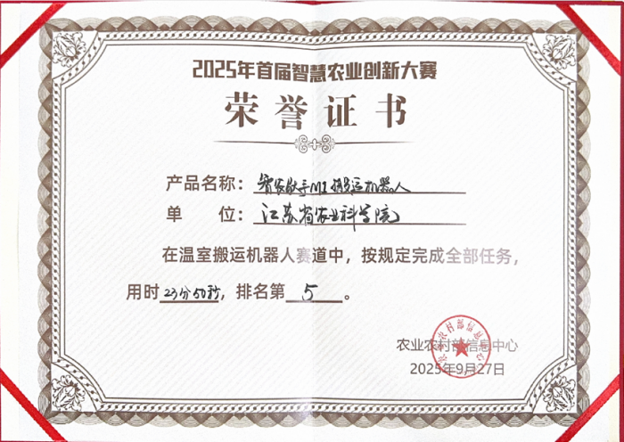 经过现场实操比拼和专家评审等激烈角逐,我院信息所智慧农业创新团队的参赛项目《温室搬运机器人-智农驮手M1》,在温室搬运机器人赛道与浙江大学、上海交通大学、江苏大学、北京市农林科学院等17家知名高校、科研院所及企业的强队同台竞技、脱颖而出,最终斩获全国第五名的优异成绩。