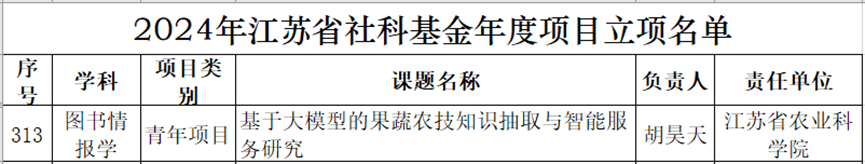 9月24日,江苏省哲学社会科学规划办公室公布2024年江苏省社科基金年度项目立项名单,信息所胡昊天博士主持申报的《基于大模型的果蔬农技知识抽取与智能服务研究》获得图书情报学科青年项目立项支持,是我院今年唯一、信息所首次获立项的江苏省社科基金项目。