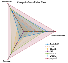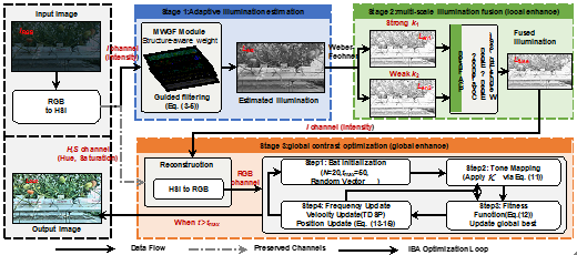 针对低照度与结构性遮挡并存的复合退化挑战,研究有三个关键创新点:(1)设计了自适应光照估计算法,利用多尺度加权引导滤波提取结构感知光照先验,有效抑制了暗区域噪声;(2)提出了多尺度光照融合机制,结合主成分分析与韦伯-费希纳感知模型,在增强局部细节的同时最小化颜色失真与伪影;(3)构建了全局对比度优化策略,采用改进的蝙蝠算法动态寻优对比度系数,实现了图像可视性与结构保真度的最佳平衡。